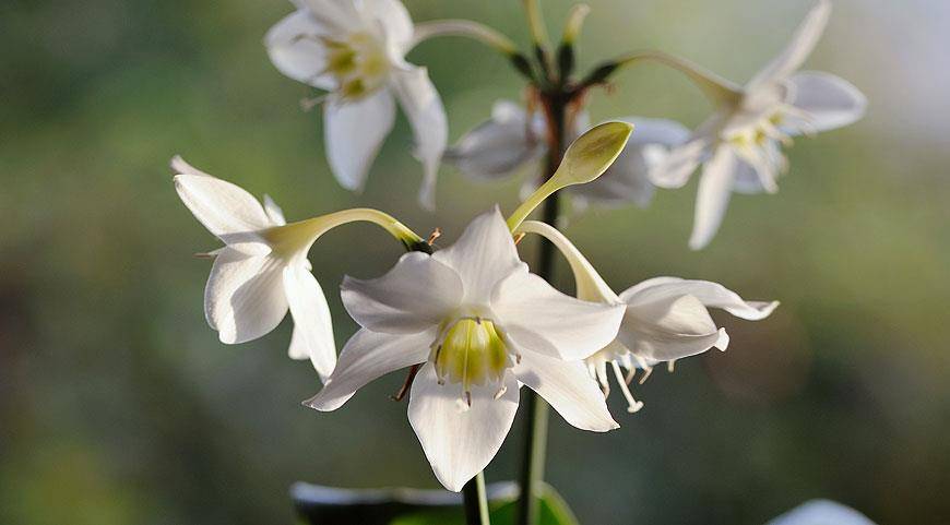 Прекрасным выбором могут стать лесной кактус-“декабрист” или эухарис. Научное название “декабриста” – шлюмбергера. Бразильцы называют их “рождественскими кактусами”, так как цветут они там в разгар лета, на Рождество. Оказавшись в Европе, уроженцы штата Рио-де-Жанейро не захотели менять привычку и по-прежнему цветут в то же самое время, в декабре, когда в Северном полушарии зима. И если цветы этого лесного кактуса добавят ярких красок зиме, то эухарис цветет изысканными цветами, похожими на нарциссы, осенью. Впрочем, его крупные листья декоративны и все остальное время года. Еще одно его достоинство в том, что этот уроженец бассейна Амазонки не требует яркого освещения, и прекрасно себя чувствует в нескольких метрах от окна.