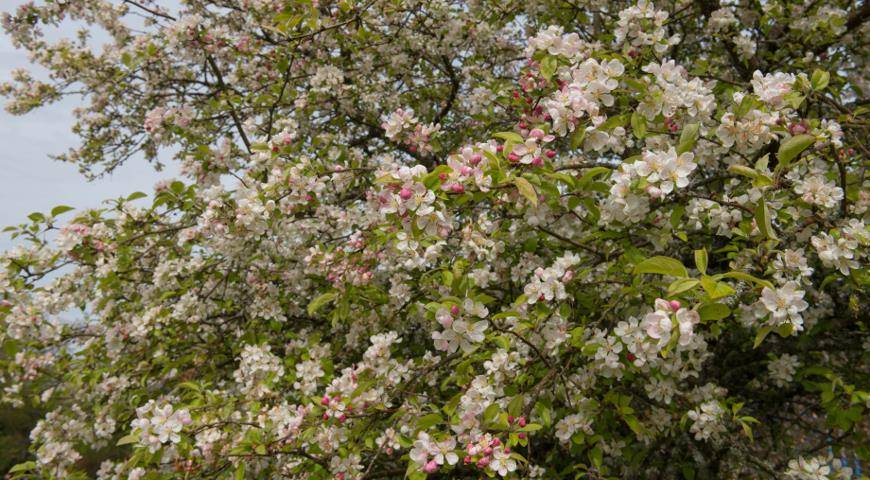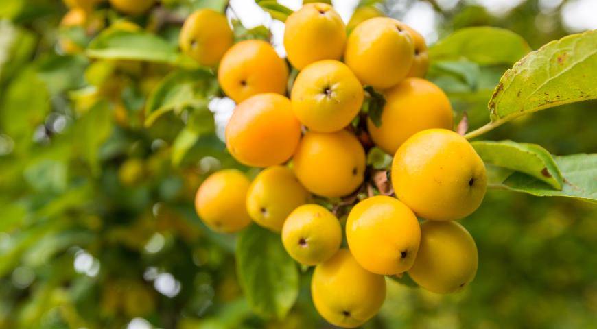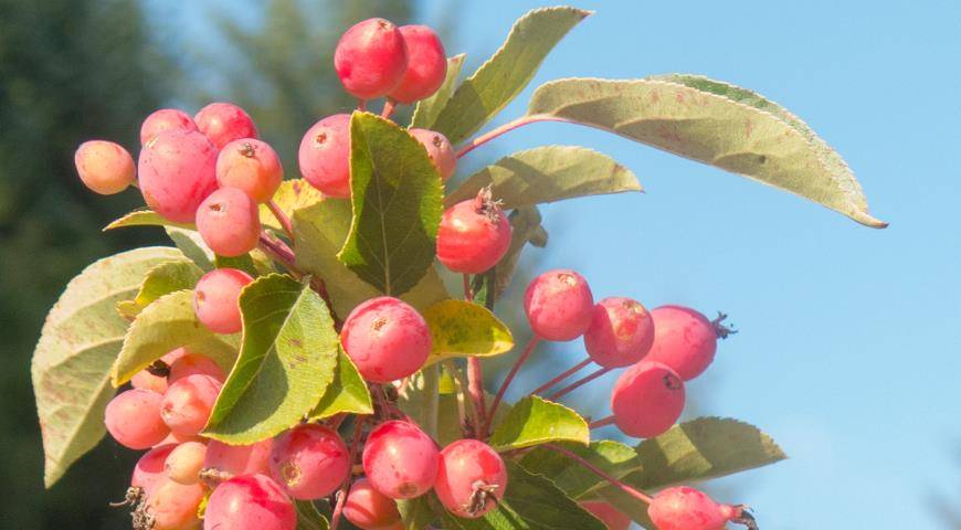 Эта яблоня также гибридная, хоть внешне похожа на обычную. Она высокая (около 5 м), ветки мощные, а листва густая и зеленая. Самая декоративная ее часть – розовато-белые цветки, собранные в зонтики, на месте которых созревают мелкие золотистые яблочки, пригодные для варенья.
