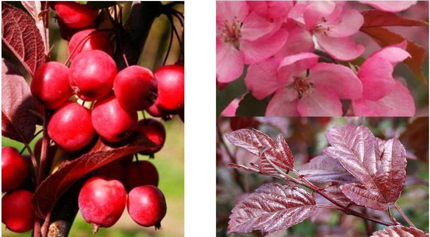 Очень оригинальный вид. Крона в виде шатра до пяти метров в диаметре. Листья пока молодые имеют фиолетовую раскраску, которая постепенно меняется на зеленую. Цветы необычной, но очень красивой темно-красно-фиолетовой расцветки. Все вместе это смотрится невероятно красиво. Плоды рубинового цвета вырастают до 5 см. Они не опадают всю зиму. И являются хорошей поддержкой птицам. К заболеваниям этот декоративный сорт очень устойчив.