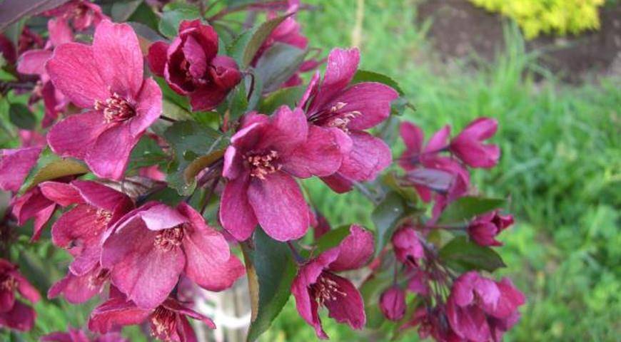 Цветки выделяются красотой, пурпурные маховой формы. После оцветения начинают произрастать маленькие яблоки, до 2-3 см в диаметре, красные.