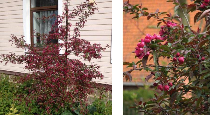 Пурпурная разновидность, являющаяся гибридом от яблони Недзвецкого. Обладает низким ростом, даже для декоративных форм – в длину достигает 5-6 метров. Но отличается шириной кроны – до 5 метров. Правильный уход и обрезка позволит вырастить из сорта не дерево, а объемный кустарник.