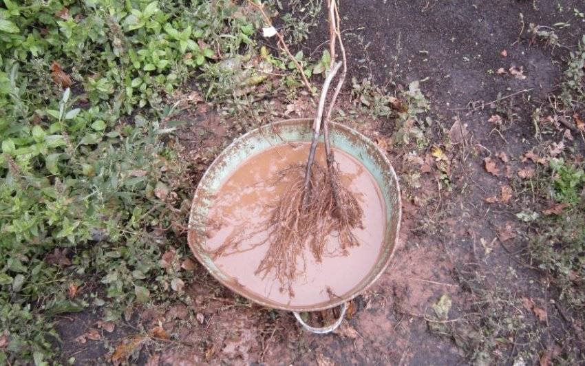 Перед посадкой обработайте саженец глиняной болтушкой. Для этого поместите его корневище в глиняный раствор на 2–3 часа.