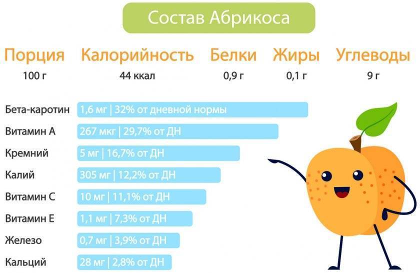 Химический состав и показатели пищевой ценности абрикосов во многом зависят от условий выращивания плодовых насаждений и длительности хранения урожая, а также от степени зрелости и используемой агротехники. В среднем на 100 г плодов приходится 0,9 г белков, 0,1 г жиров и 9 г углеводов при общей калорийности продукта не более 44-45 ккал.