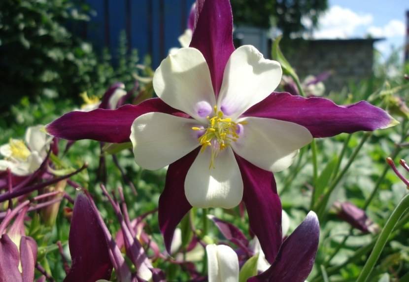Аквилегия синяя (A. coerulea James.). Родина – Мексика. С крупными, дважды тройчатыми листьями. Цветок с голубыми чашелистиками, белыми лепестками и длинным шпорцем. Есть сорта с различной окраской цветка.