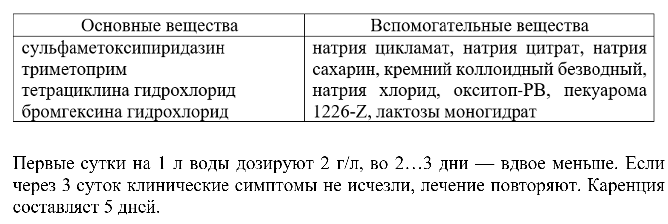 Антибиотик позволяет предупредить появление инфекций у птенцов. Средство действенно в борьбе с куриным микоплазмозом, бронхопневмонией, колибактериозом и энтеритом. Дача препарата в профилактических целях должна проводиться в тот момент, когда птенцы начинают выходить на выгул и могут быть инфицированы возбудителями заболевания. Также можно проводить профилактическое выпаивание и в период с 5 до 10 дней после вылупливания.