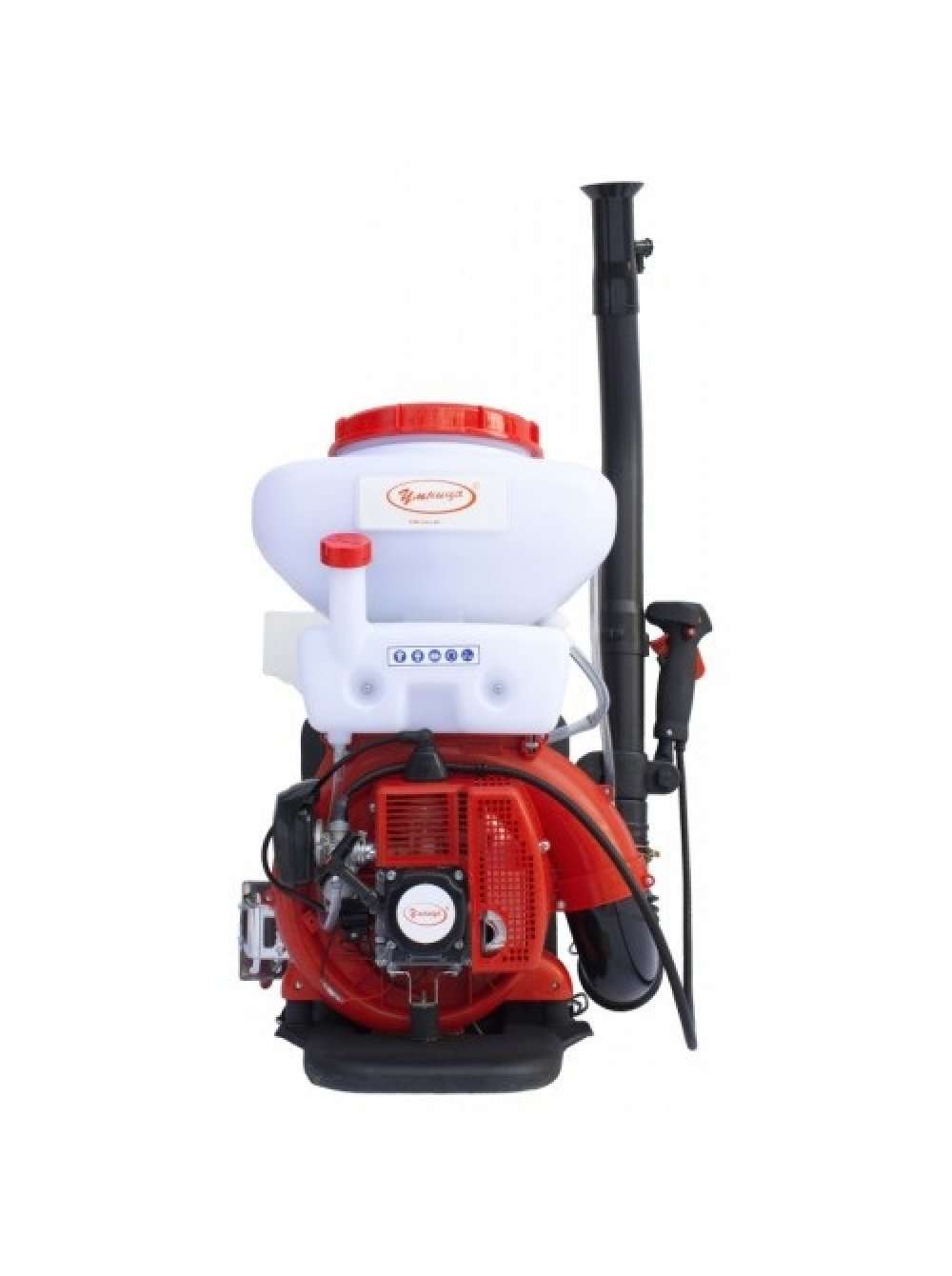 Носят опрыскиватель на плечах, как ранец – для этого предусмотрены широкие лямки с мягкой подкладкой и регулировкой длины. Заводится двигатель вручную, но сильно шумит во время работы, выдавая 113 дБ. Трубка телескопическая и выдвигается до 120 см, в комплекте идут различные насадки. Дальность струи достигает 7 м при максимальной мощности.