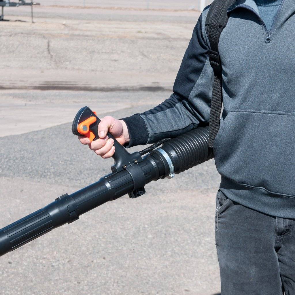 - Переносить вручную удобно только легкие воздуходувки (до 5 кг). Чтобы прибор не выскальзывал из руки, рукоять оснащается прорезиненной вставкой.