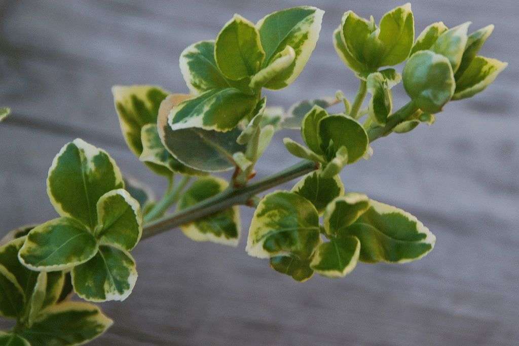 - бересклет японский (Euonymus japonica) — кустарник с зубчатыми эллиптическими листьями с желтыми, золотистыми или белыми пятнами, не превышающими 8 см в длину. Цветков у бересклета немного, они мелкие, бледно-желтые, собраны в пазушные соцветия. После цветения (в июне-июле) на их месте образуются кожистые коробочки оранжево-розового оттенка.
