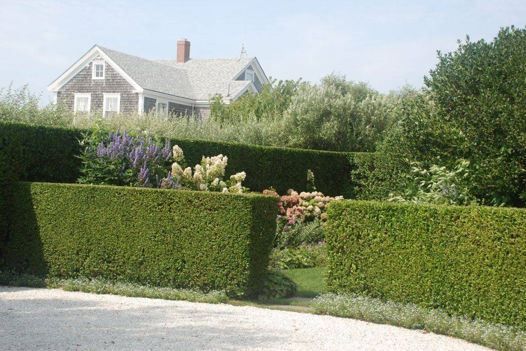 Если подстригать живую изгородь в форме прямоугольника, то за счет того, что не будет хватать света, нижняя ее часть оголится, поэтому предпочтительнее форма трапеции.