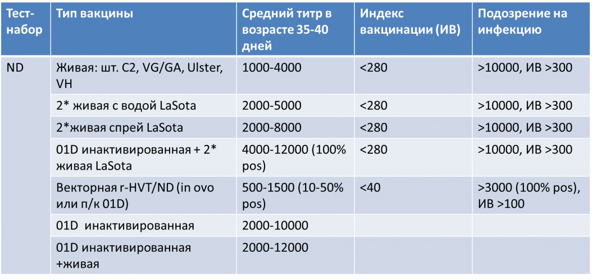 Интерпретация полученных результатов согласно МУ № 988: по результатам РТГА определяют эффективность иммунизации в партии цыплят путем деления суммарного количества проб с титром антител 1:8 и выше (после применения живых вакцин) или 1:16 и выше (после применения инактивированных вакцин); птиц считают невосприимчивыми к НБ при эффективности иммунизации 80 % и более после применения живых вирусвакцин и 90 % и более после использования инактивированных.