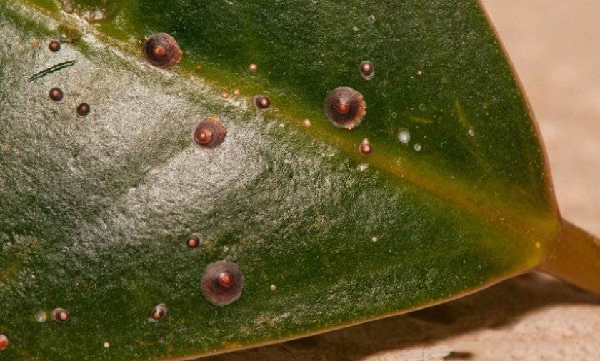 Щитовку можно обнаружить на стебле. Это небольшое насекомое с панцирем. Оно сосёт сок из растения.