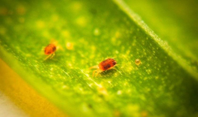 Паутинного клеща можно обнаружить на нижней листовой пластине. Он выглядит как мелкая чёрная точка. Это сосущий паразит, питающийся соком растения.