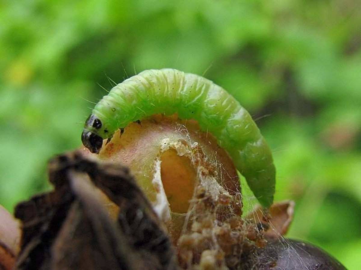 Огневка – мелкая бабочка, которая откладывает яйца в цветки крыжовника. Вылупившиеся из них личинки сразу оказываются в плодах и выгрызают их изнутри.