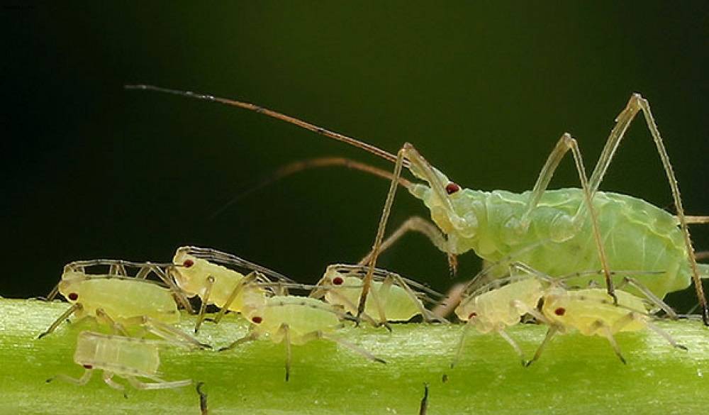 Молодая тля очень быстро размножается на сочных листьях и стеблях комнатных растений
