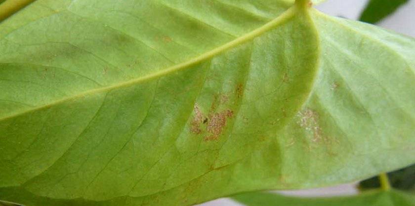 Ещё одна возможная проблема – желтоватые или коричневые пятна, распространяющиеся на листьях и вызывающие их опадение.