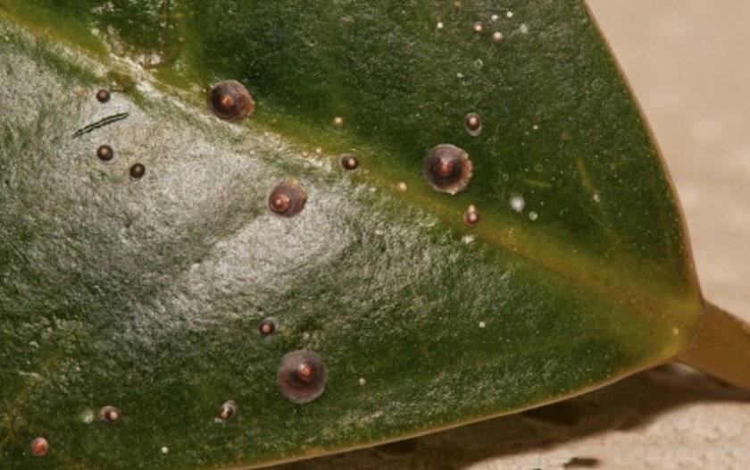 Чаще всего они появляются именно на листочках, а уже потом покрывают все зеленые части цветка. Щитовка питается соком растения и из-за этого листья начинают сохнуть и рваться. Для лечения рекомендуется использовать любые фунгицидные препараты.