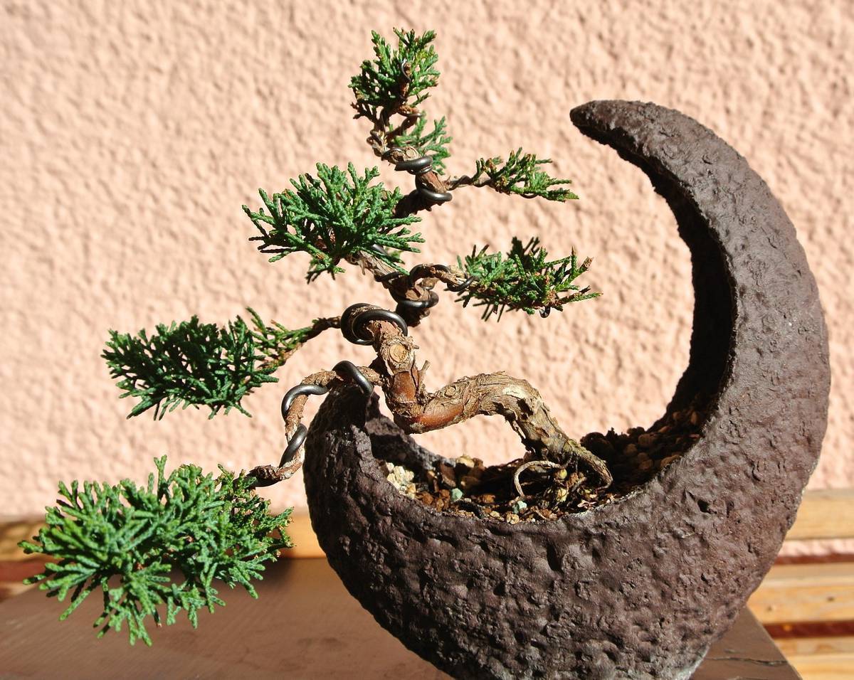 Искусству бонсай уже более тысячи лет. Можжевельник более всего подходит для этого. Его можно вырастить таким, как представляется. Само слово «бонсай», означающее «дерево в плошке», говорит о том, что высаживают растение в плоский горшок. Когда корни сильно прорастут, их обрезают и снова пересаживают в плоский горшок.
