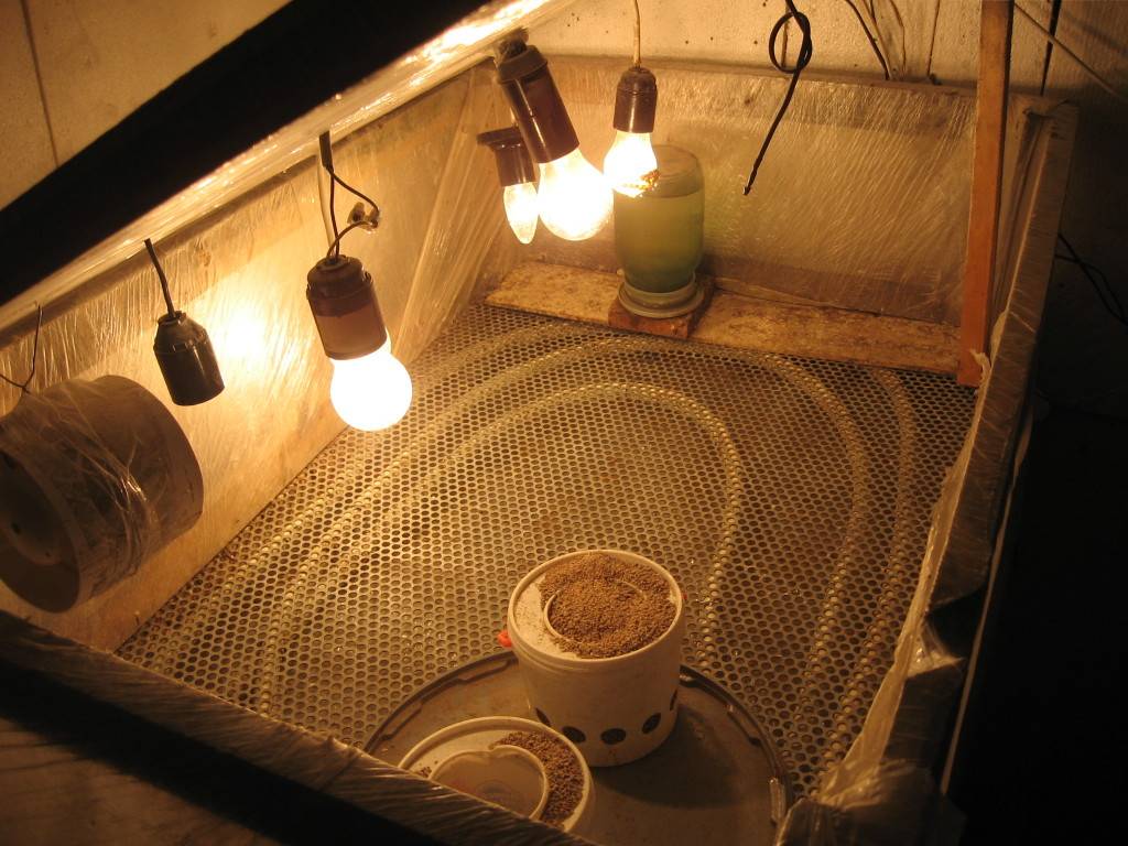 - Для поддержания необходимой температуры воздуха и интенсивности освещения установите инфракрасную лампу. При её отсутствии можно использовать обычную лампочку 60 Вт.