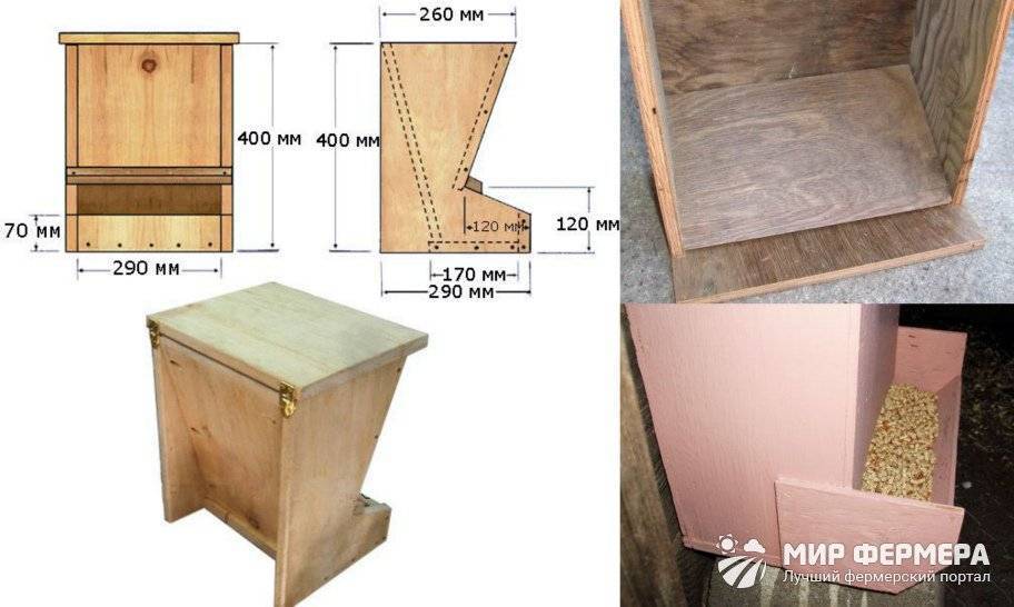 И что принципиально важно, происходит это автоматически, без участия человека. Итак, самая простая бункерная кормушка состоит из двух основных частей — отсека для запасов корма и открытой площадки (лотка), из которого птицы могут беспрепятственно склёвывать зерносмесь