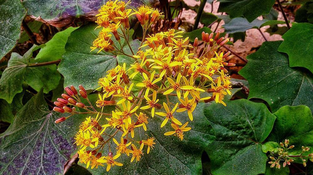 Язычковые цветки соцветий-корзинок бывают желтыми, золотисто-желтыми, оранжевыми. Соцветия корзинки собраны в щитковидные соцветия. Ценная особенность растения: оно хорошо растет в тени, а ведь достаточно трудно подобрать достойное крупное растение для плохо освещенных уголков сада.