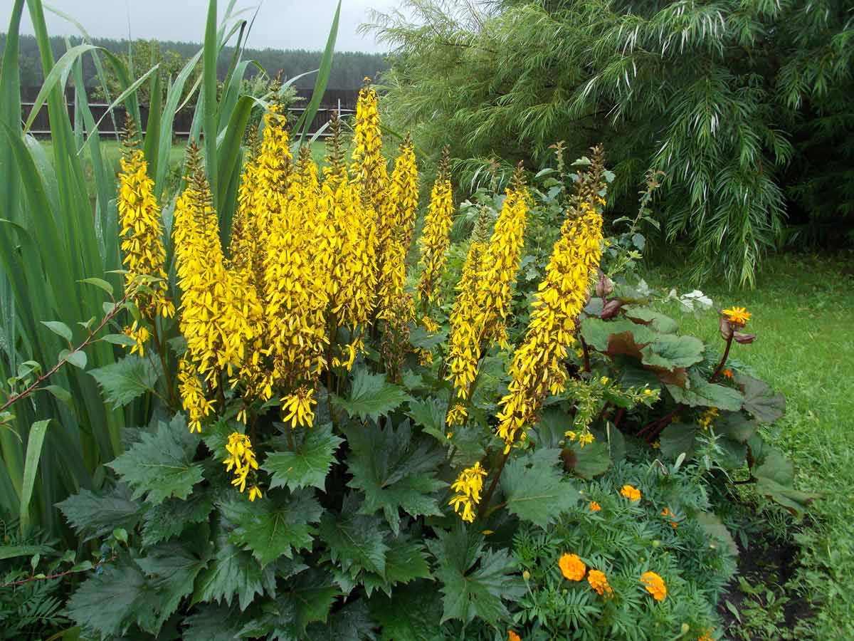 Лигулярия – мощное, красивое и статное растение. Размер его листьев, их окраска, высота цветоносов впечатляют даже привередливого садовода. Этот цветок можно выращивать на заднем плане цветочной композиции или как растение-солитер. Он не останется незаметным в дальнем уголке сада, будет красиво окаймлять задний берег искусственного прудика. Посадка нескольких растений в ряд замаскирует неприметный сарайчик или старый забор.