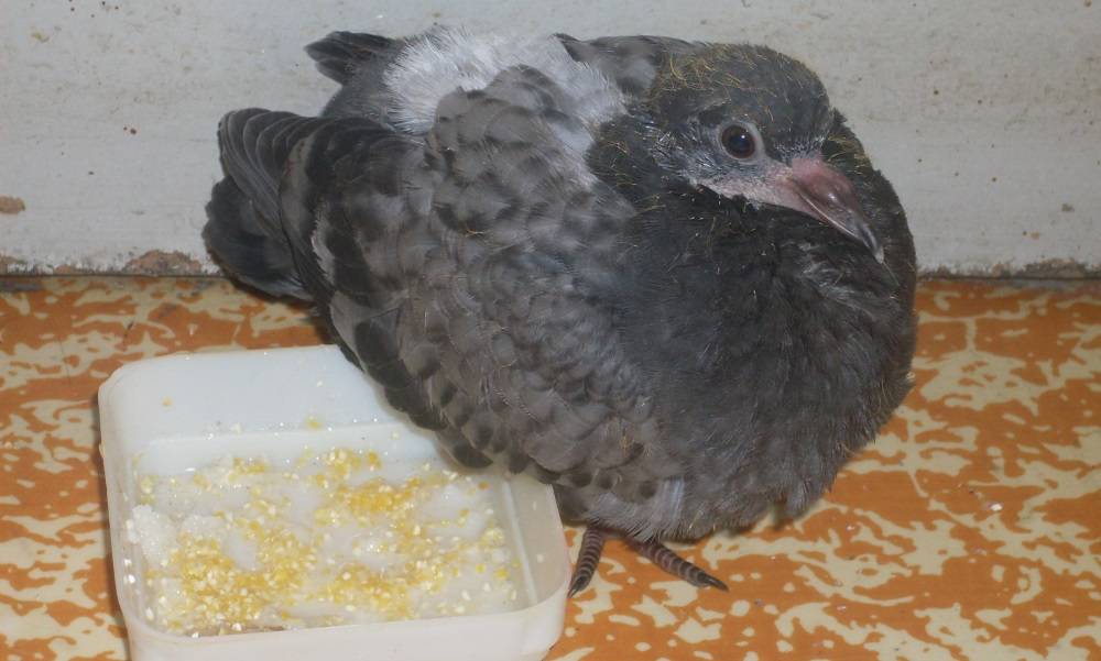 С 2 недель важно обеспечить их водой, чтобы они не страдали от жажды. В целях приучения потомства голубей к клеванию, в 3-4 недели добавляют в питание немного мелких зерновых культур