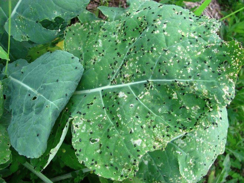 При осмотре поврежденных кочанов блохи абсолютно невидимы, т. к. устраиваются в середине вилка. Только по изрешеченным листьям и желтизне вокруг отверстий огородники догадываются о нашествии вредителя.