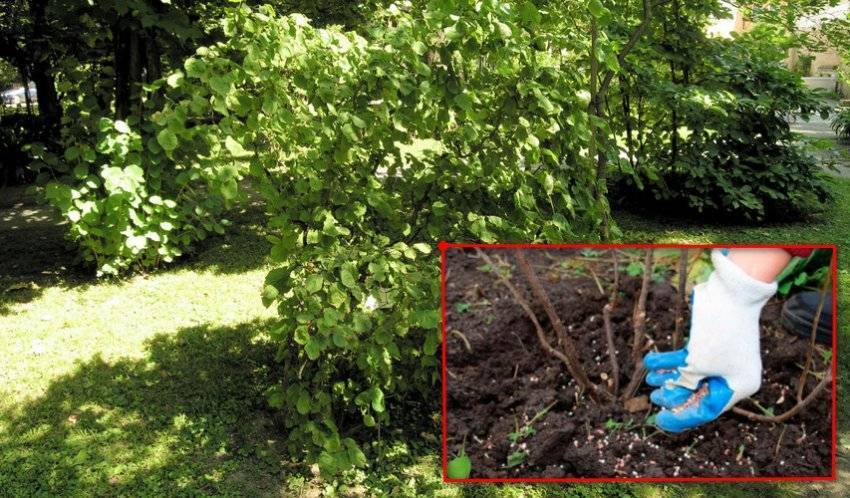 В первый раз лесной орех удобряют весной при посадке, заделывая в посадочную яму 150 г суперфосфата, 50 г калийной соли, 2–3 ведра перегноя или же 5–8 кг навозной жижи. Для лучшей усвояемости их распределяют равномерным слоем по средней и верхней частям лунки, слегка присыпая сверху чистой почвой. В дальнейшем каждый год можно подпитывать кустарники 1–2 вёдрами перегноя (либо других органических смесей) и 100–150 г нитроаммофоски или готового удобрения «Кемира».