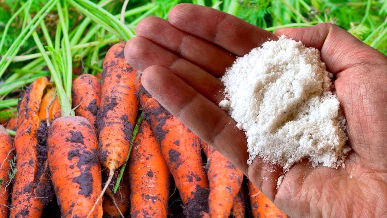 - Соль – улучшает вкус корнеплода и обычная поваренная соль, которую просто для полива растворяют в воде. Кроме того, солевой раствор помогает справиться с такими вредителями, как морковная муха и слизни.