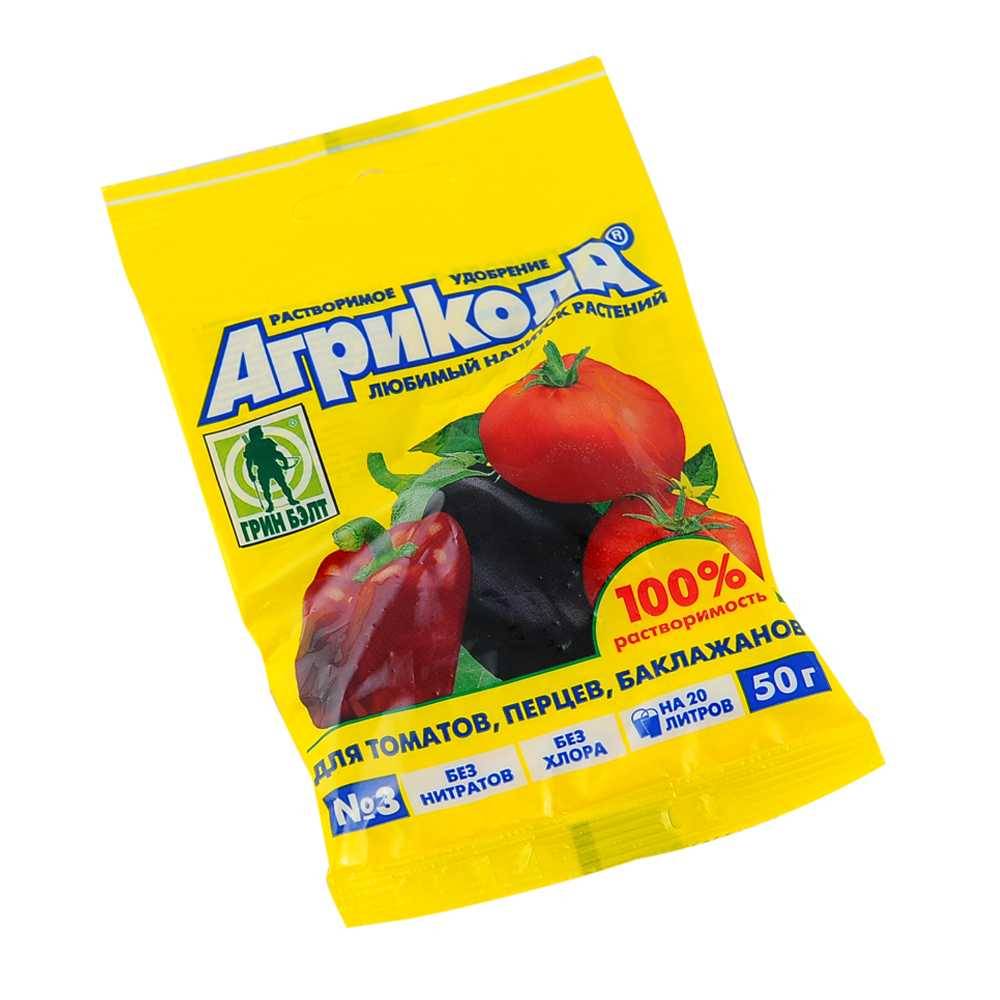Агрикола для томатов №3. Состав: NPK 13-20-20 + MgO +микроэлементы. Нормы расхода 25 г на 10 л воды, хватает на 10—20 м2 засаженных гряд томатов в теплице или открытом грунте. Производитель не указывает дозировки минералов, но удобрение неплохое, использовать только как самостоятельное.