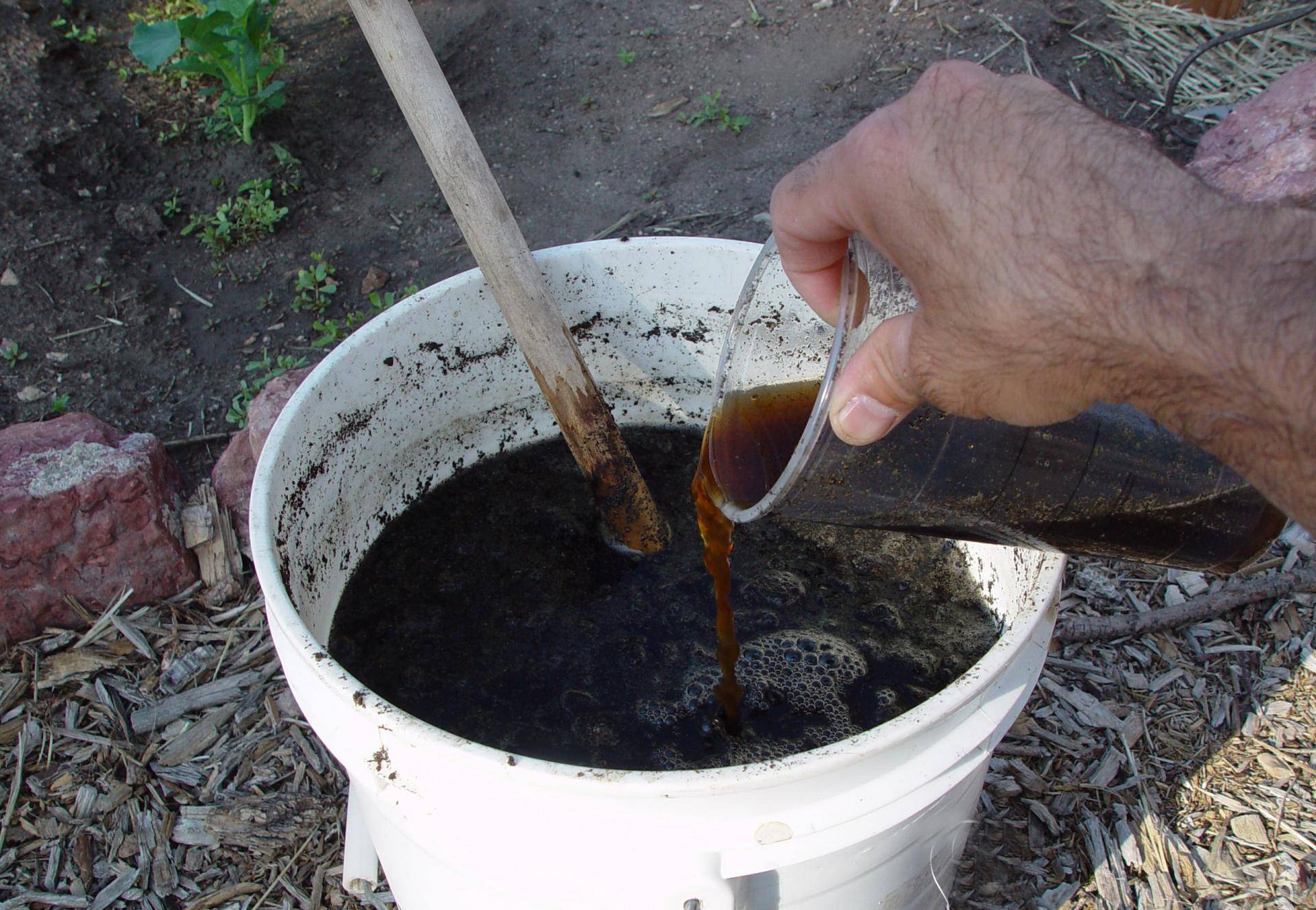 - Для полива используем двухдневный настой навоза (1:10) или птичьего помёта (1:20, можно взять магазинный гранулированный).