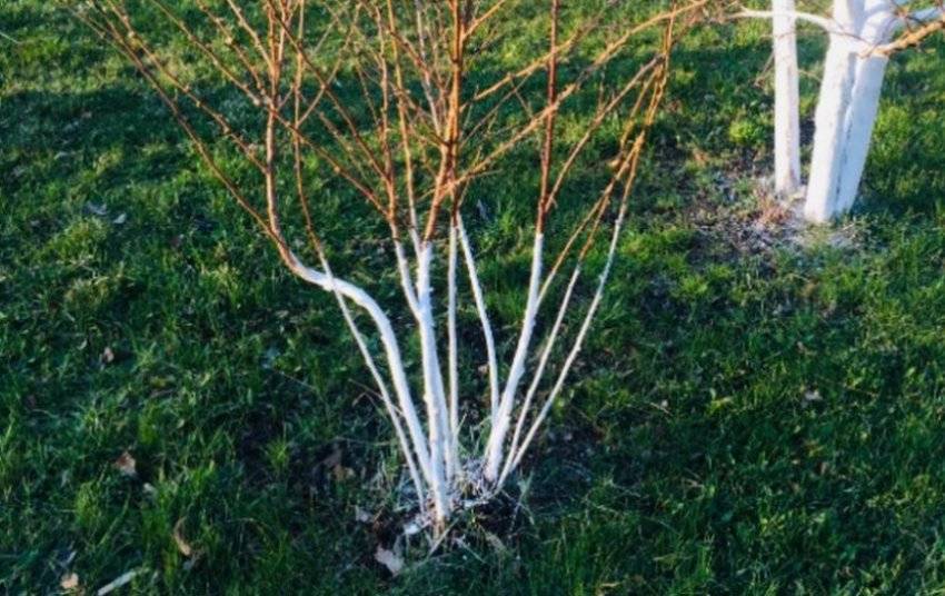 Если вы всё же решите белить кустарники, тогда наносить побелочный слой нужно лишь на толстые ветки, на высоту 30–40 см от корня.