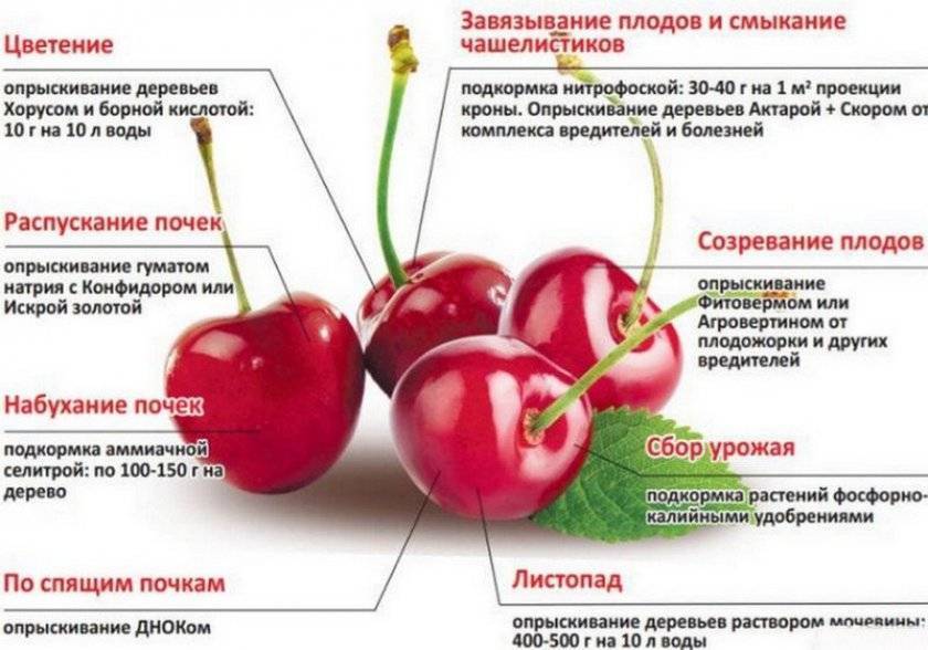 | Вишневая муха, бабочки и долгоносики | Наличие личинок на листьях | Обработка весной и осенью раствором мочевины. На 10 л воды берут 700 г вещества. |