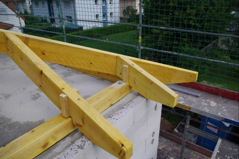 - Укладка и крепление мауэрлата. Под ним нужно проложить гидроизоляцию из рубероида поверх стены здания. По углам мауэрлата устанавливаются четыре укосины для усиления конструкции в продольном направлении.