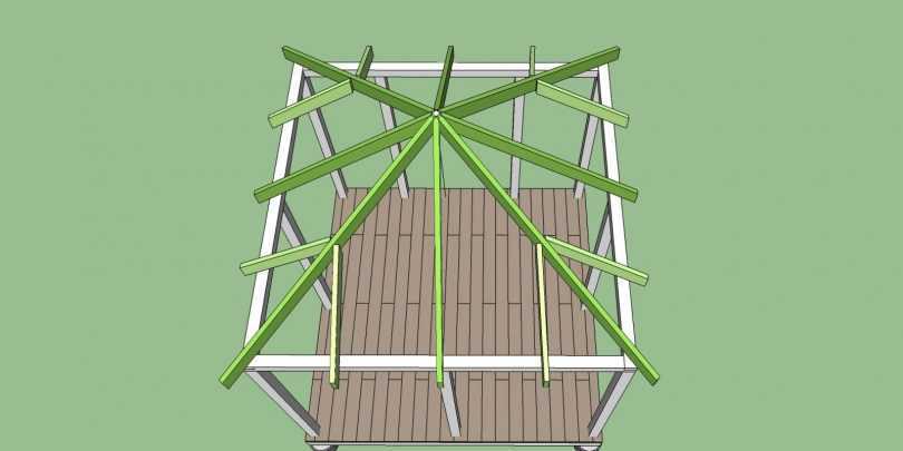 Но учитывайте, что чем большую крышу вам нужно построить на беседке, тем больше в ней будет стропил и тем сложнее будет ее структура. Например, вот стандартный и проверенный вариант, который вы даже можете взять в качестве чертежа:
