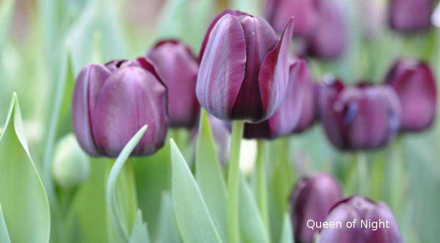 Queen of Night. Королева ночи ценится за глубокий бордовый цвет, максимально близкий к бархатному чёрному. Цветёт в мае. Цветок достаточно крупный, около 9 см, благородной классической формы. Стебель гибкий и изящный. Его высота достигает 65 см. Тюльпан этого сорта не требователен к свету, подходит для выращивания в полутени. Используется для оформления букетов и декора цветников.