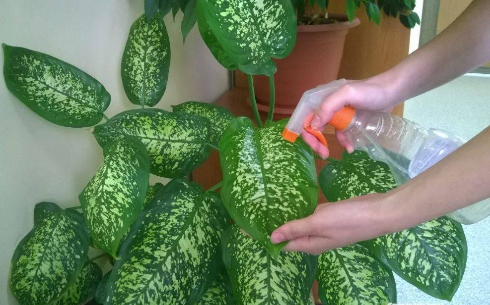 Влажность воздуха. Диффенбахия любит очень влажный воздух, требуется регулярное опрыскивание и обмывание листьев. Перед опрыскиванием убедитесь, что в комнате тепло и ни откуда «не поддувает», иначе можно навредить растению. Если же в комнате около 18°C, лучше не опрыскивать, а просто периодически протирать влажной губкой.
