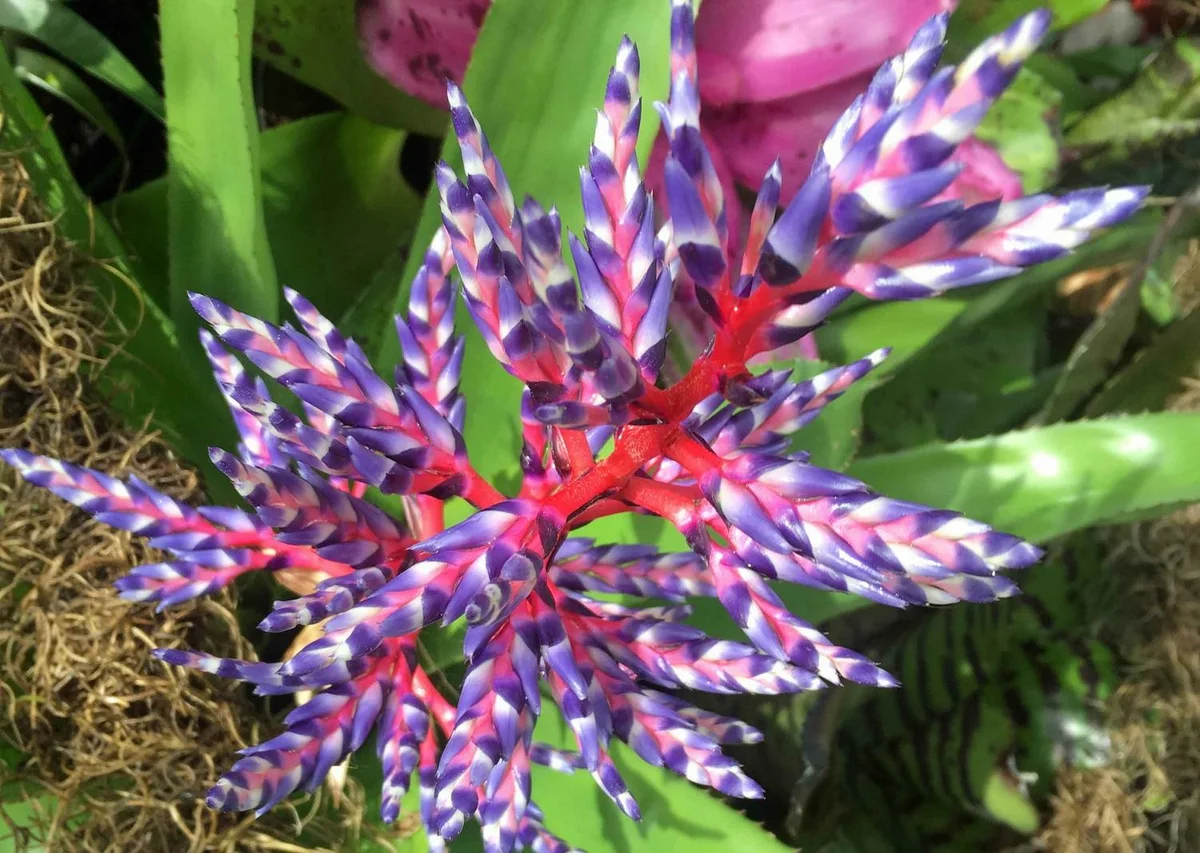 - Стоит сказать, что цветет эхмея только один раз за все 7 лет, предназначены для растения. Сам бутон цветка имеет необычную форму, он стоит из соцветия, которое образовывается из большого количества мелких цветочков и прицветников сиреневого и фиолетовых оттенков. Появляется бутон из сердцевины листков.