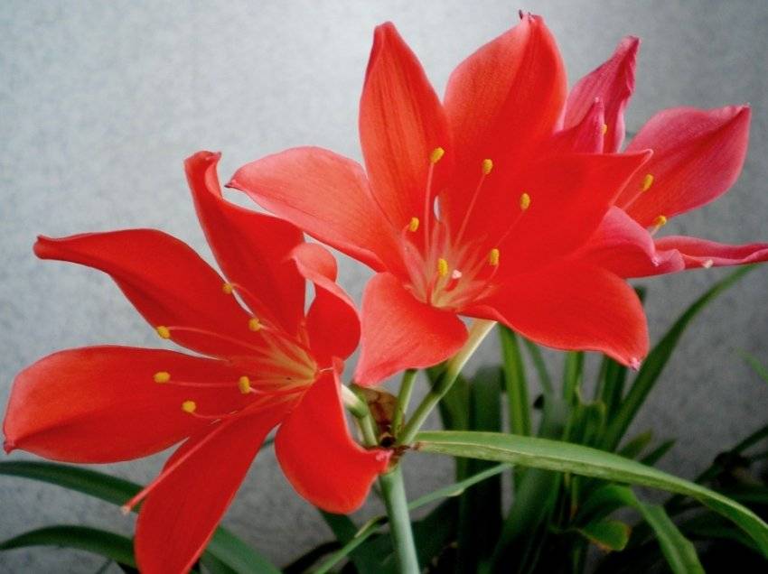 - Валлота прекрасная. Листья в форме меча, длиной 40–45 см, очень плотные на ощупь. Высота цветоноса — 30–35 см. Он вырастает строго из центра луковицы. Соцветие в форме зонтика состоит из 3–6 цветков. Длина цветка — 7–8 см, диаметр — 8–10 см. Цвет лепестков варьируется от красно-оранжевого до темно-алого в зависимости от условий выращивания.