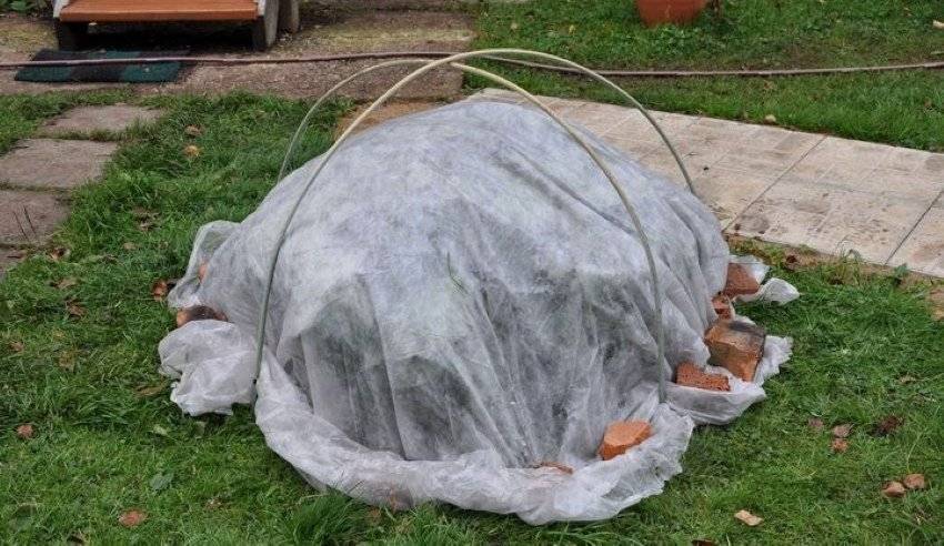 Если взрослый куст слишком жесткий, его можно не пригибать к земле, чтобы не сломать побеги. Достаточно обвязать растение шпагатом или бечевкой и обмотать мешковиной, спанбондом или другим материалом, пропускающим воздух.