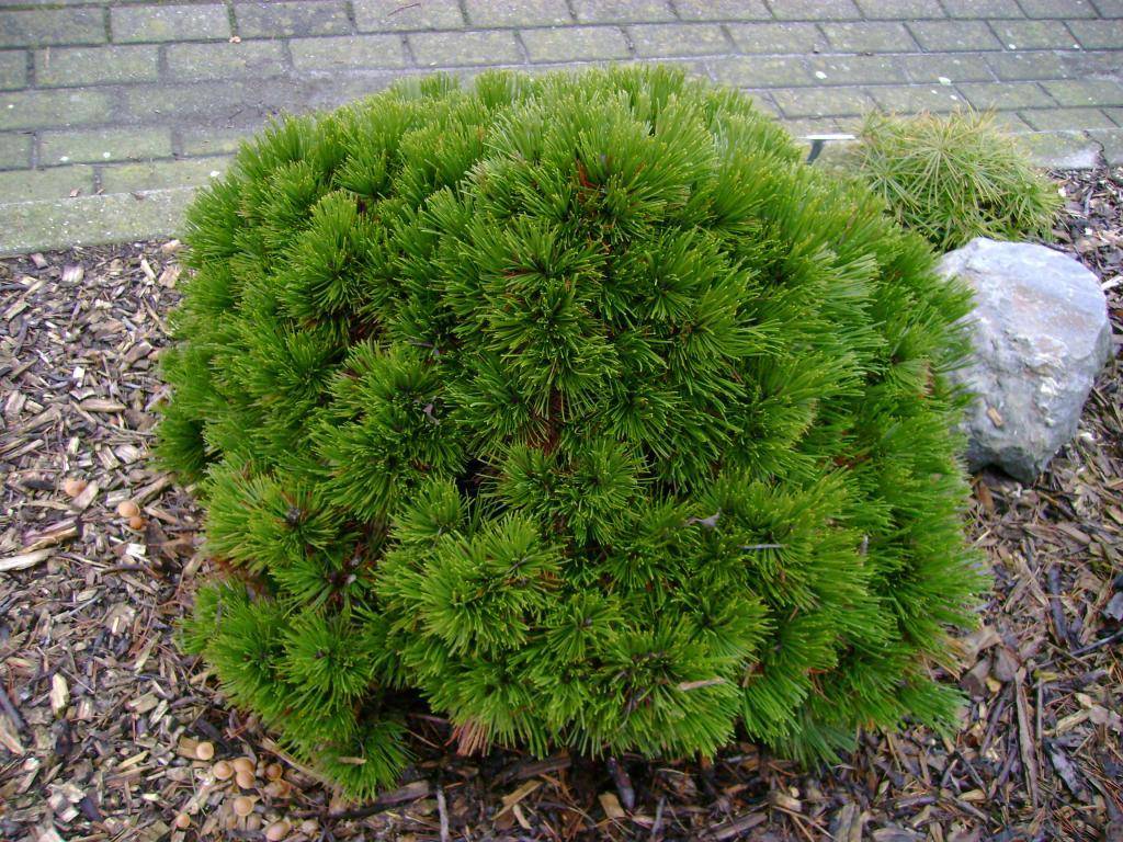 Сосна горная. Характерная особенность — шарообразная крона, устойчива к грибковым заболеваниям и заморозкам. Из сортов сосны горной можно выделить: