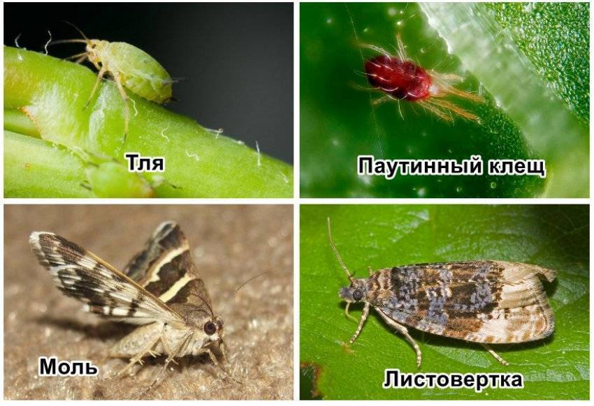 Из насекомых наибольший вред приносят тля, листовёртка, моль, паутинный клещ. Чтобы избежать их пагубного воздействия, рекомендуется воспользоваться такими препаратами, как «Вектра» (2,7 мл на 10 л воды), «Топаз» (10 мл на 10 л воды), «Гамаир» (2 таблетки на 1 л воды), «Инта-вир» (1 таблетка на 10 л воды), «Фитоверм» (2 мл на 250 мл воды), «Актара» (1 г на 10 л воды) и др.