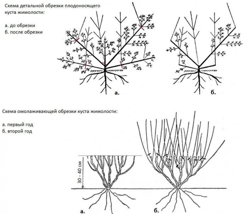 Молодые кусты жимолости в обрезке не нуждаются. Так как цветочные почки закладываются на побегах текущего года, то проводя обрезку молодых веточек, вы можете не получить урожая в будущем году. Исключение — поломанные ветви. В возрасте куста 6–8 лет проводят омолаживающую обрезку. Ветви вырезают полностью, оставляя пенёк над землёй около 15 см. На каждом кусту после такой омолаживающей обрезки должно остаться 3–5 старых ветвей