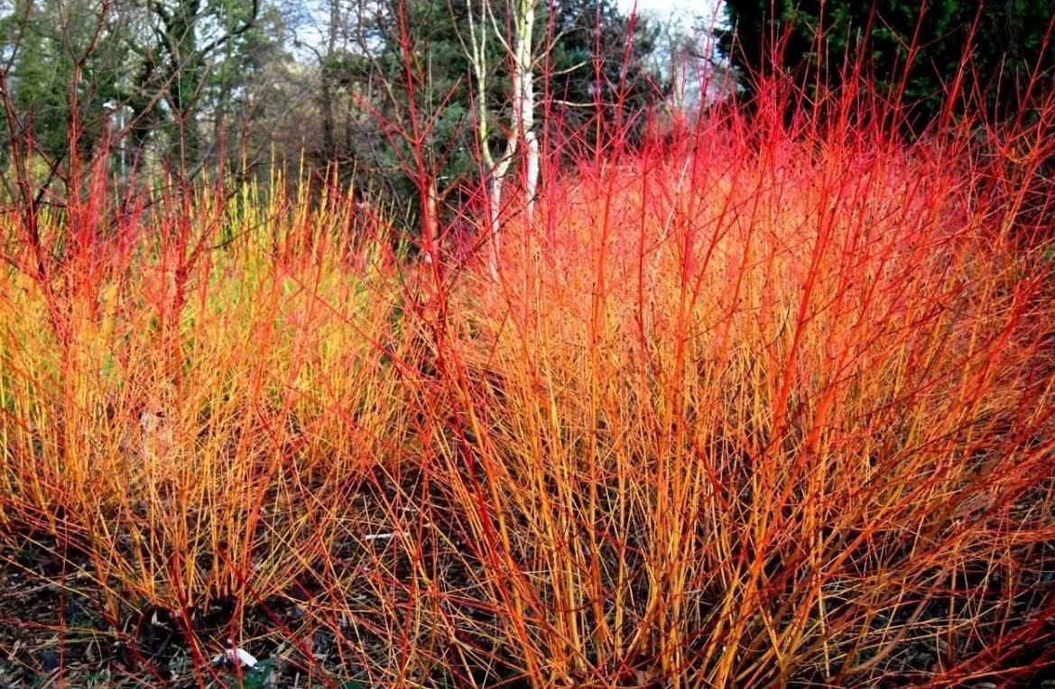Яркие побеги свидины отличаются привлекательным глянцевым оттенком. Они могут играть разными тонами: оливковым, благородным бордовым, алым, желто-лимонным, цвета охры. Зимой разнообразие красок выглядит еще более заметно, особенно в пору сброса листьев.