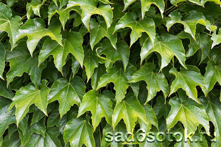 Листья пальчатые, состоят из 3–5 яйцевидных листочков с пильчатыми краями и заостренной верхушкой. Осенью они меняют зеленую окраску. На солнце становятся ярко-красными, в полутени – желтыми.