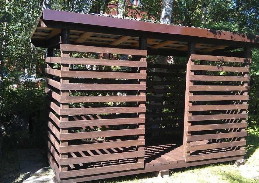Открытый дровник может быть в виде каркаса с полом и крышей без стен, может иметь одну, две или три стены. Красиво выглядит в виде беседки.