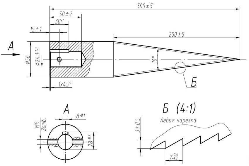 В основе изделия лежит двигатель, который, запускаясь, приводит в движение привод. Последний передает вращающий момент на шкив, а с него — на вал. На другом конце вала находится винт. Его остроконечное строение завершает резьба на поверхности. Изготавливать конус своими руками — сложная затея. Вам понадобится виртуозное владение токарным станком. Вот пример чертежа:
