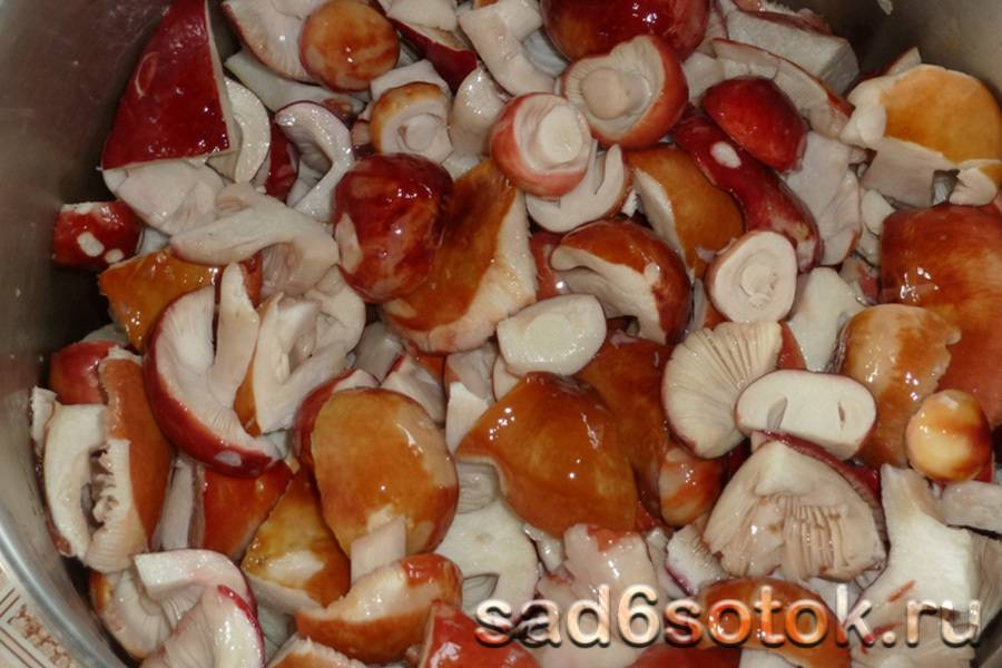 Используют виды без горечи – сыроежки пищевые и зеленые. После первичной обработки их отваривают в подкисленной и подсоленной воде из расчета 40 г соли и 10 г лимонной кислоты на 2 л воды. Нужно учесть, что при варке они значительно усядутся, уменьшившись в объеме, и в конце готовки опустятся на дно.