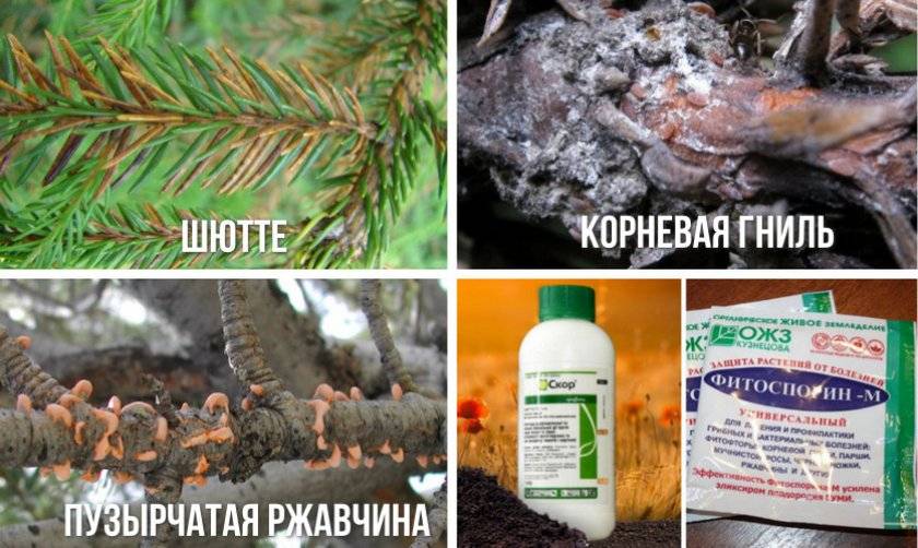У хвойных деревьев достаточно сильная структура. Ели хорошо переносят многие негативные внешние факторы, но вот с болезнями иногда приходится долго бороться. В основном все недуги хвойных устраняют с помощью фунгицидных препаратов. При малейшем поражении обрабатывается приствольная земля и сам ствол дерева. Затем почва хорошо поливается по корневой системе.
