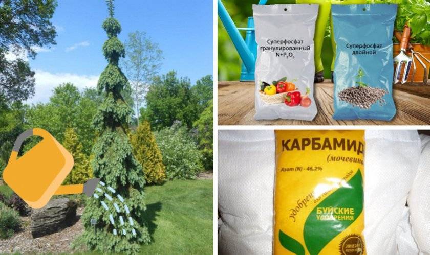 Для этой цели можно использовать искусственные смеси из минеральных удобрений, например, двойной суперфосфат из расчёта 15 грамм на м² и мочевина — 20 грамм на м². Благодаря подкормке ель быстрее растёт, меньше подвержена воздействию болезней или вредителей и лучше переносит зиму.